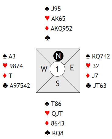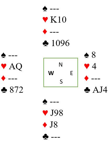 Mot 2 spar spiller vest ut ruter knekt, makkerens farge. Det ser ut som ni stikk med en spartaper, to hjertertapere og en rutertaper om ikke kløveren kan utnyttes. Ruter ess vinner første stikk, så spar til østs ess. Derfra kom de fleste steder tre ganger hjerter, og syd stjal tredje gang. Så tas trumfen ut, og vest må følge tre ganger. Underveis sitter nok syd og tenker at det var fint de ikke tok ut nords andre ruterhonnør, for her kan det kanskje bli ti stikk ved å bruke sin siste trumf til å stjele godt kløveren som kan sitte 3-3. Og nords andre ruterhonnør er fint å ha i behold som inntak. Kløveren satt imidlertid ikke, men det oppstår en søt posisjon idet den fjerde trumfrunden spilles:
