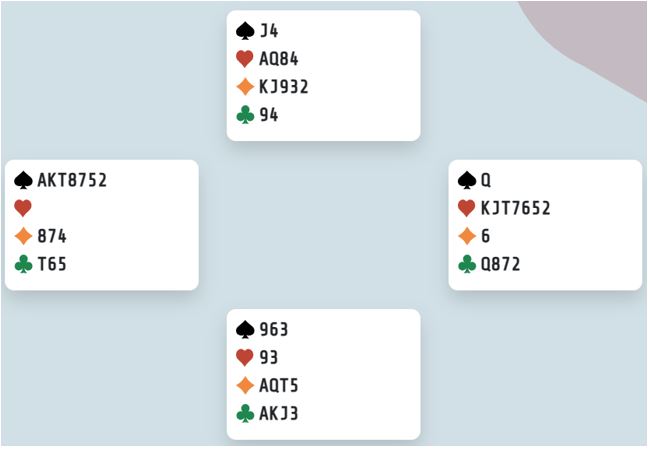 Heiberg Evenstad (nord) og Geir Helgemo fikk litt ekstra informasjon i meldingsforløpet. Helgemo åpnet med 2NT med sine 19 gode poeng. Da Heiberg-Evenstad overførte med 3 hjerter doblet øst, og det gjorde syds kort enda bedre med A-Q-10 bak østs hjerter! Det videre meldingsforløpet var mer preget av logikk enn system, og de endte i 7 spar som med den tilgjengelige informasjonen østs dobling av 3 hjerter ga var så godt som 100% sikker!