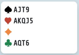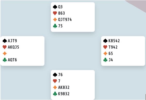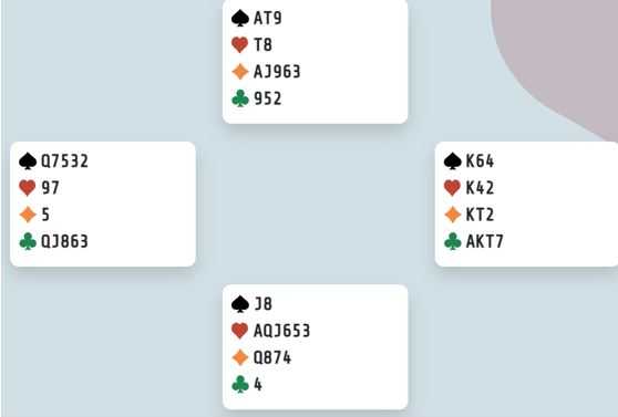 Nord skal altså spille 6 hjerter som er en bra kontrakt. Problemet er at det kan bli to hjertertapere, så det er faktisk bedre i grand- eller kløverkontrakt hvor det behøves kun to hjerterstikk for å å komme til 12 (2+2+3+5=12). Hva gjør du etter ruter knekt ut fra øst mot 6 hjerter?