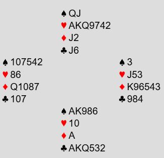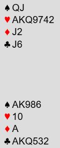 Sunndalsøra sin nord åpnet med 1 hjerter, og syd svarte syd 2 kløver. Det var en tvetydig melding som kunne innebære litt forskjellige ting, og nord sa 2 ruter som viste ekstra verdier. Det tre første meldingene ble alertert. Da meldte syd 2 spar som var naturlig, og det viste minst fire spar og minst femkorts kløver vil jeg anta. Nord hoppet til 4 hjerter, og da spurte syd om nøkkelkort med 4NT (inntil videre med hjerter som trumf). Nord viste to nøkkelkort og trumfdamen, altså vet syd at nord har AKQ i hjerter og sannsynligvis syvkorts farge. Syd avsluttet meldingene med 7NT.