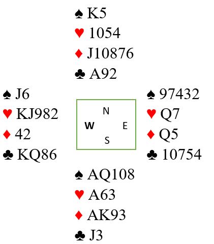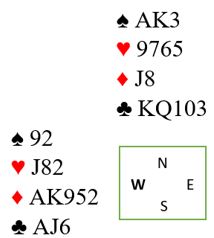 Ved det andre bordet åpnet øst med 1 ruter og vest svarte 2NT (11-12). Nord doblet, og øst sa 3NT. Hjerter dame kom i utspill. Ved det bordet stakk spillefører den andre hjerteren i håp om at fargen var fodelt 4-4), for det ser unektelig skummelt ut om de finner sparskiftet. Men da hadde syd en hjerter til å spille idet han kom inn i kløver. Det ble en bet, Sunnfjord +50 og 10 IMP. Kampen ble altså vunnet med 21 IMP.