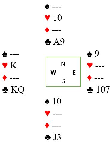 Idet spar 10 spilles blir vest skviset sønder og sammen. Enten må han kaste hjerter konge slik at spillefører får for kløver ess og hjerter 10 til slutt, eller vest må kaste en kløverhonnør. Gjør han det forsvinner hjerter 10. Kløver 3 til esset tar med seg den andre honnøren, og kløver knekt gir det tolvte stikket.