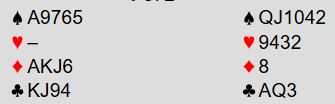 Vest prøvde 4NT - Key Card Blackwood, men da øst hadde ett nøkkelkort visste ikke vest med sikkerhet hvilket det var så det kunne mangle to nøkkelkort, og vests trumfkvalitet er ikke særlig god. Så de stoppet i 5 spar.
