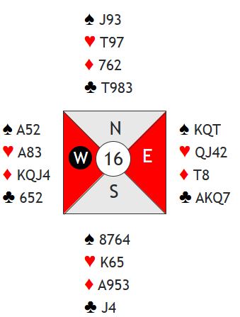 Med kløveren 2-1 var spilleføringen i 6 kløver en formalitet. Nord får ett sparstikk. En hjerter kan kastes fra vests hånd på ruter, og tre hjertere kan etter å ha tatt ut trumfen i to runder trumfes (dvs. resten står på kryss-stjeling).