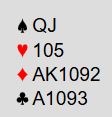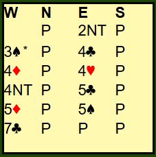 For Lunde BK sa vest 3 spar - minorstayman. Da skal 2NT-åpneren si 3NT om han ikke har minst fire kort i en minorfarge, 4 i minorfargen om han har det. Øst sa 4 kløver. Jeg kjenner ikke parets system, og gjetter litt. Men jeg tror det var kontrollmeldinger og Key-Card hvor vest fikk vite om tre nøkkelkort før han spurte om trumfdamen (kløver) med 5 ruter. Da sa øst 5 spar, "ja, jeg har trumfdamen og jeg har også spar konge, men ikke hjerter konge". Nå ligner det veldig på storeslem, gjør det ikke? For øst har A-K i spar som gir avkast for en hjerter. Øst har ikke hjerter konge (man viser laveste konge på spørsmålet), så maks 6 (eller 7) HP der. Og med KQ i kløver blir det totalt ca. 18 poeng, så øst har mest sannsnylig ruter dame i tillegg. Hele meldingsforløpet ble slik: