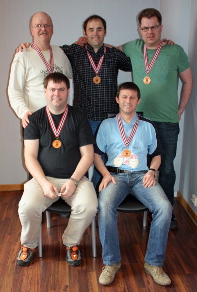 Våre helter i Namsos klarte prøven og slo ut Kristiansand i 6. runde. De er dermed klar for finalen! En konsentrert Ragnar og en håpefull Jørn studerer blindemann Kampen mellom Namsos og Kristiansand ble utsatt pga askeproblemene fra Island, men ble spilt innen fristen satt av NBF. Namsos var vel favoritter hos de fleste, men alle lag som har kommet så langt er gode. Kampen var lenge jevn men Namsos vant ca 40 IMP på de siste 6 spillene i første halvrunde. Andre halvrunde var også jevn og sluttresultatet ble til slutt 100 - 63 til hjemmelaget! Rapportene sier at det var slemsvingene som gikk i Namsos sin favør. Finalen går i Ålesund fra 13-16 mai (les mer her) Namsos er etter mange eksperter blandt favorittene til å vinne NM i år, så vi håper mange følger med på BBO og turneringens hjemmeside! Vi gratulerer Ragnar Davidsen, Per Arne Flått, Frode Nybo, Geir Enge, Gunnar Øvereng og Jørn Arild Ringseth med finaleplass og gleder oss til å følge med! Glade gutter!
