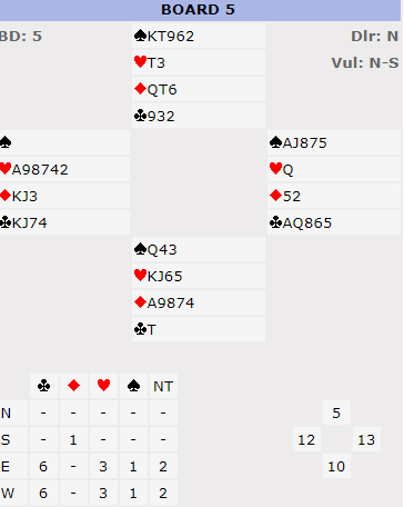 Riktig rutervalg og bra timing i spilleføringen ga Ø/V +12 IMP mens en eller to bet som mange altså gikk i 5 kløver (!) ville gitt 7 IMP til N/S, nesten 20 IMP i sving. Slikt svir i korte 9 spillskamper. Men man kan ikke klage over det, det er mer enn nok IMPs som kom den riktige veien pga. dårlig spilling av motparten!